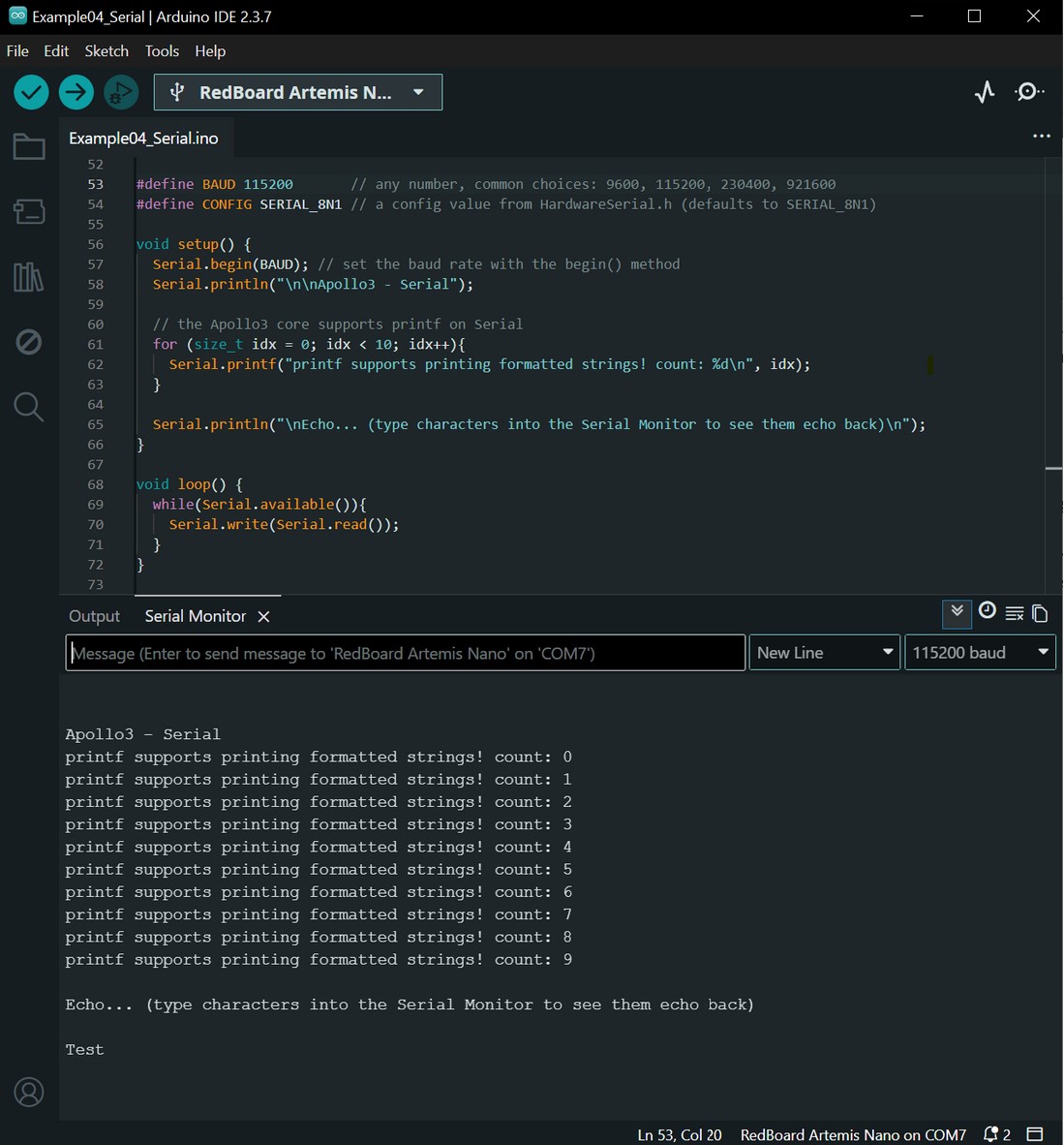 I ran the Example4_Serial example to test the serial printing. I set the baud rate in the Serial Monitor to 115200 baud and made sure it is the same value in the sketch. I typed in “Test” as the message, and the serial monitor printed “Test”.