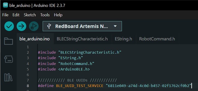 I uploaded ble_arduino.ino to the Artemis board.