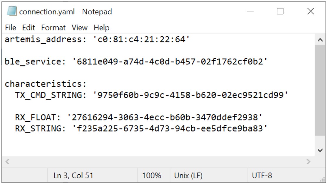 I checked the UUIDs in ble_arduino.ino and connections.yaml to make sure they are the same.