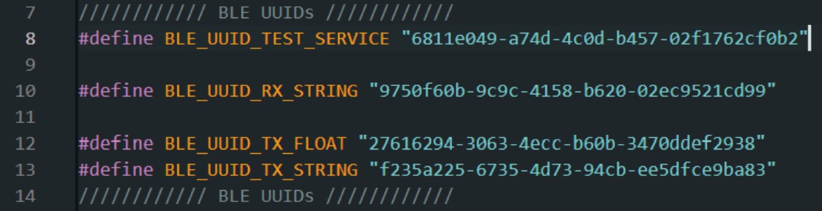 In ble_arduino.ino, I replaced the BLEService UUID with the generated UUID.