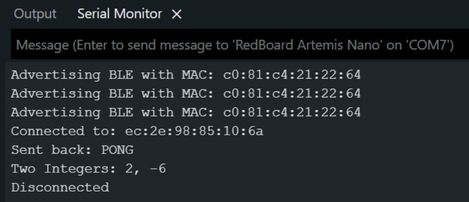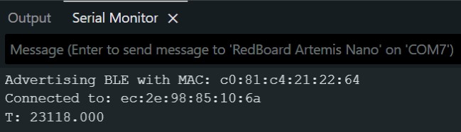 In connections.yaml, I updated the MAC address to artemis_address: 'c0:81:c4:21:22:64', using the address printed in Serial Monitor.