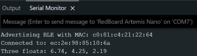 The Artemis board received the three floats and the values are printed in the Serial Monitor.
