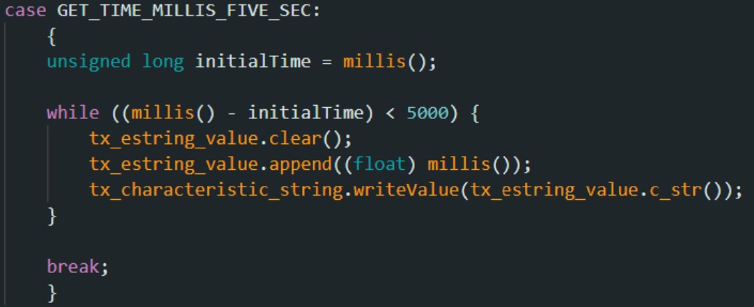 I created a new command GET_TIME_MILLIS_FIVE_SEC by modifying cmd_types.py and CommandTypes in ble_arduino.ino.