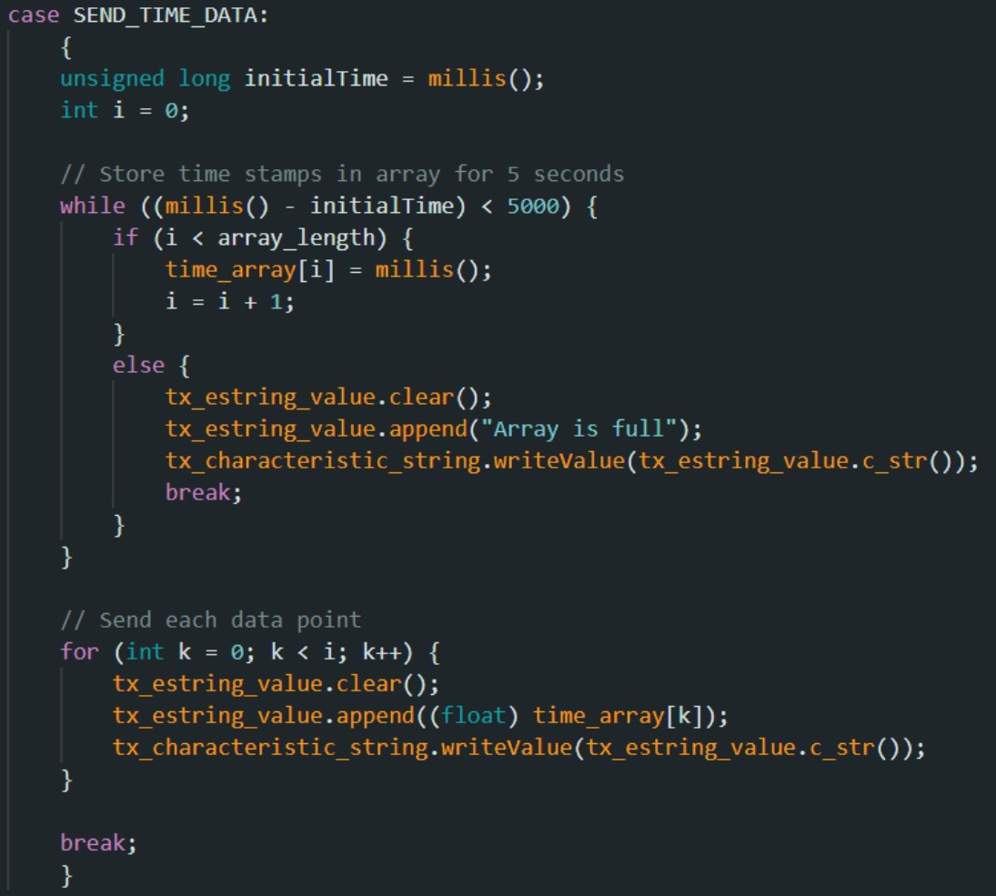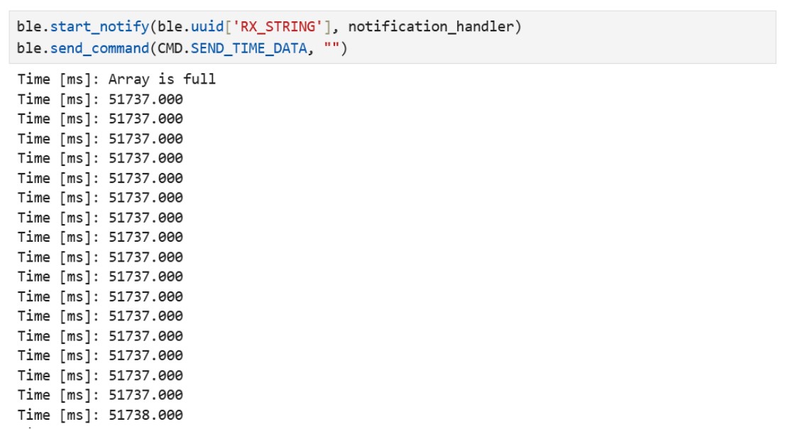 I created a new command SEND_TIME_DATA by modifying cmd_types.py and CommandTypes in ble_arduino.ino, similar to Tasks 3 and 5. I created an array time_array with a size of 300 in the global variables.