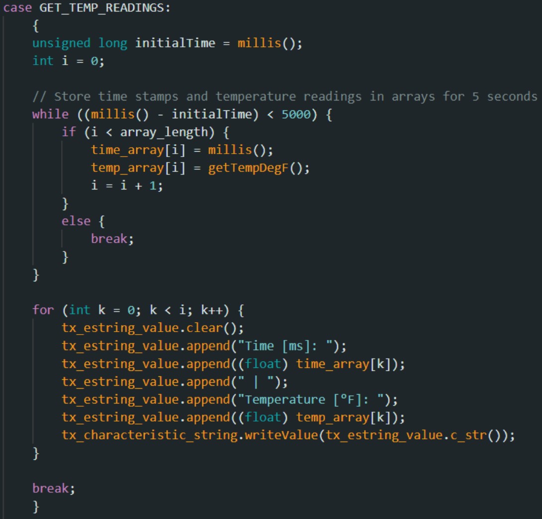 I created a new command GET_TEMP_READINGS by modifying cmd_types.py and CommandTypes in ble_arduino.ino, similar to Tasks 3 and 5. I created a new array temp_array with the same size of 300.