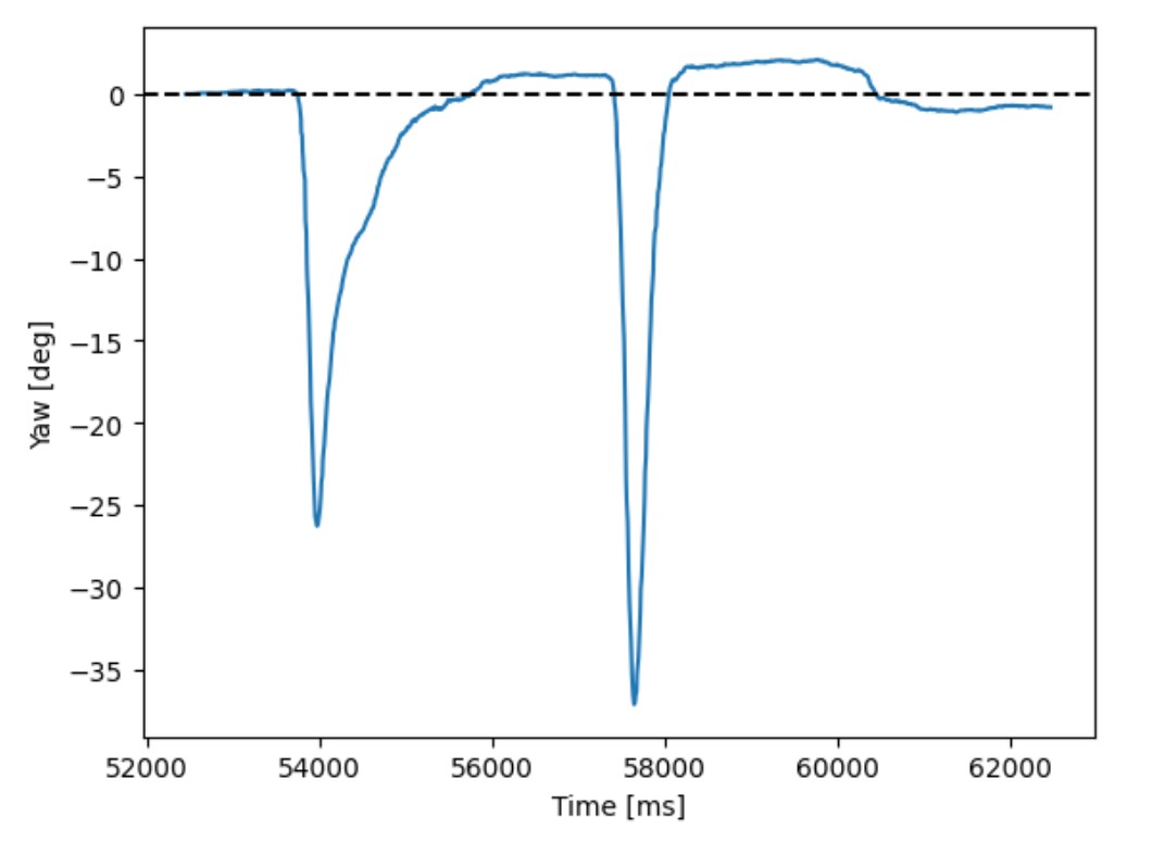 Based on the graph of yaw readings below, the yaw reading slightly drifted to around 0.1 degrees after roughly one second. This would cause an error of ~6° after one minute.